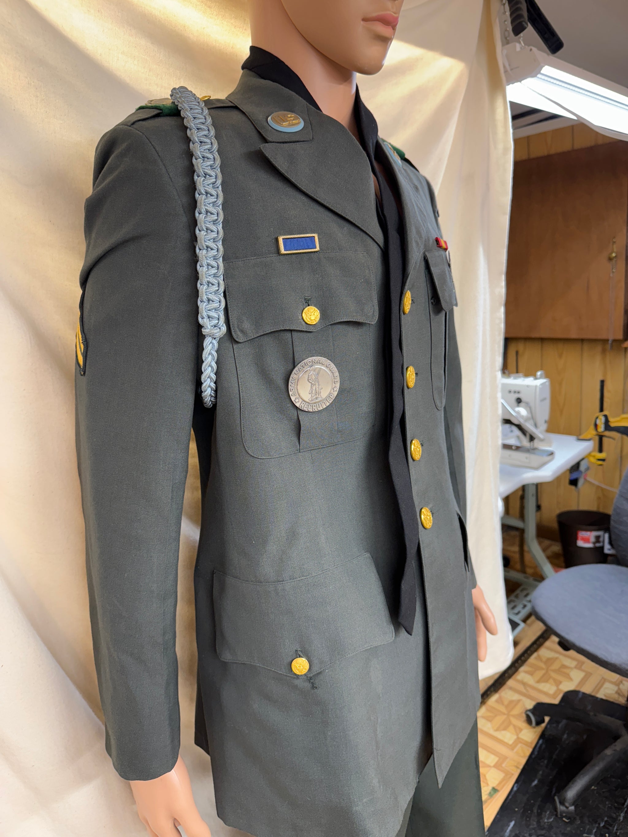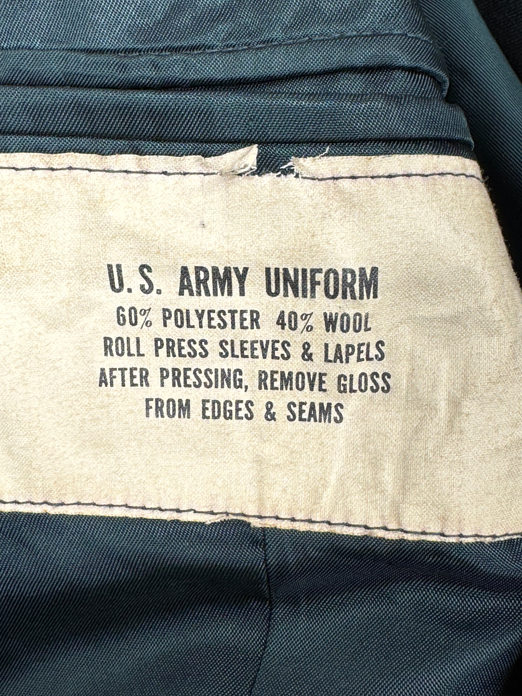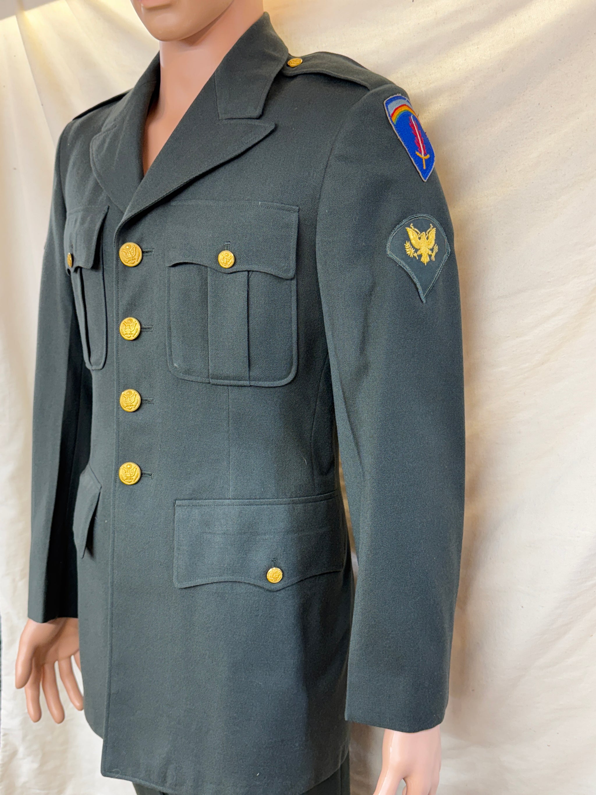 Condition:Excellent Item Description~ Vintage Dated 1959 Military Issue US Army Wool Serge Coat-Named Vintage WW II Rainbow Sword Patch Army Good Conduct Medal Ribbon collar disc...