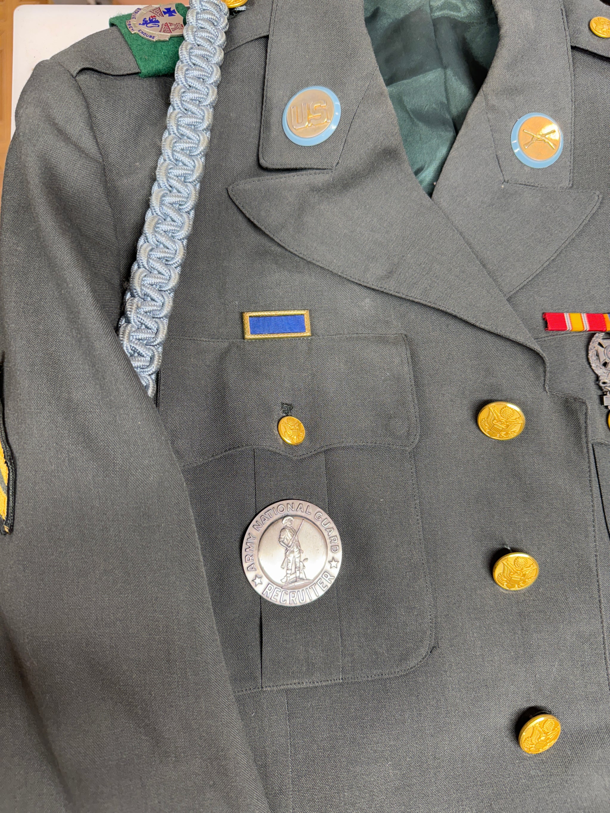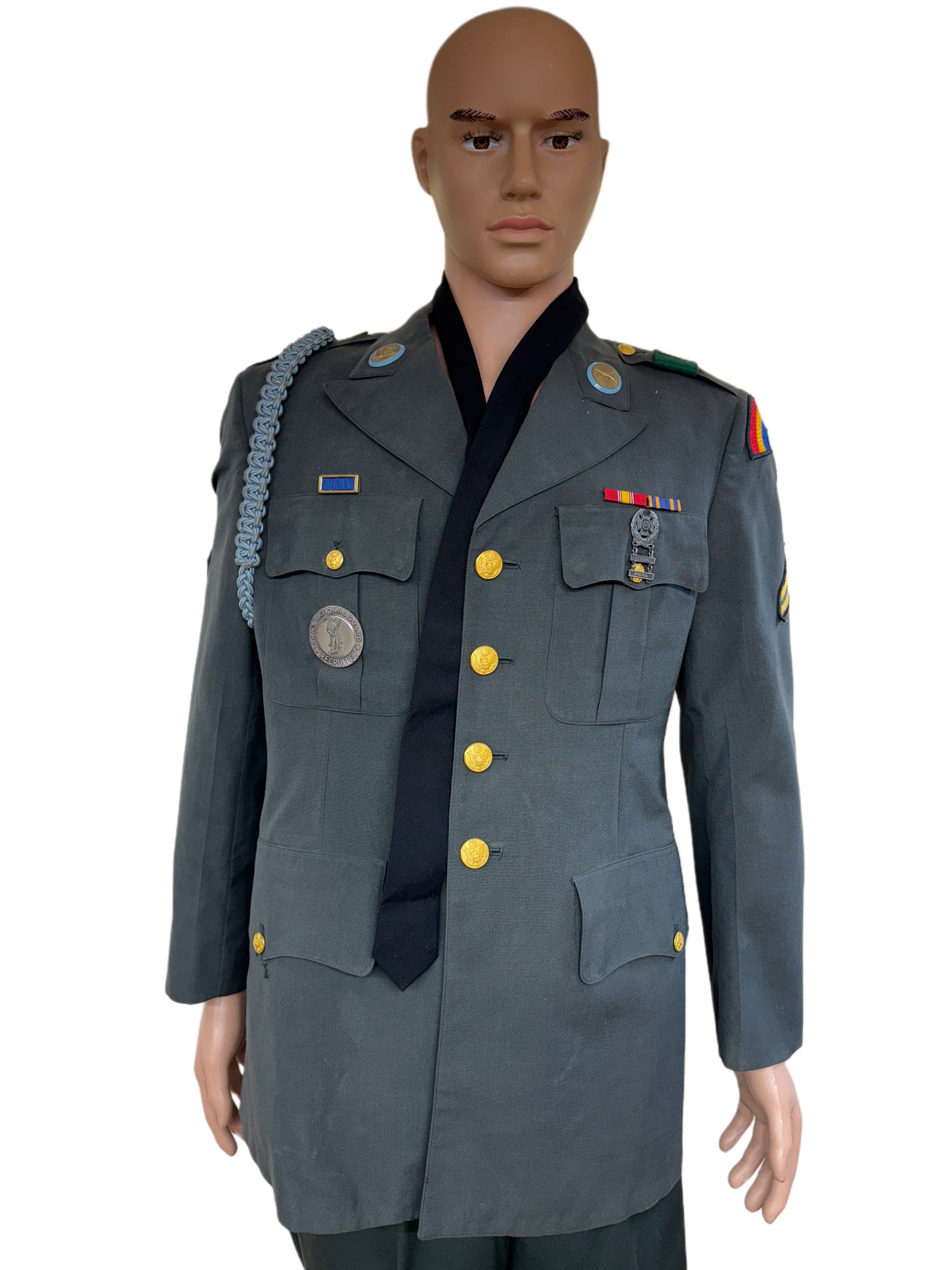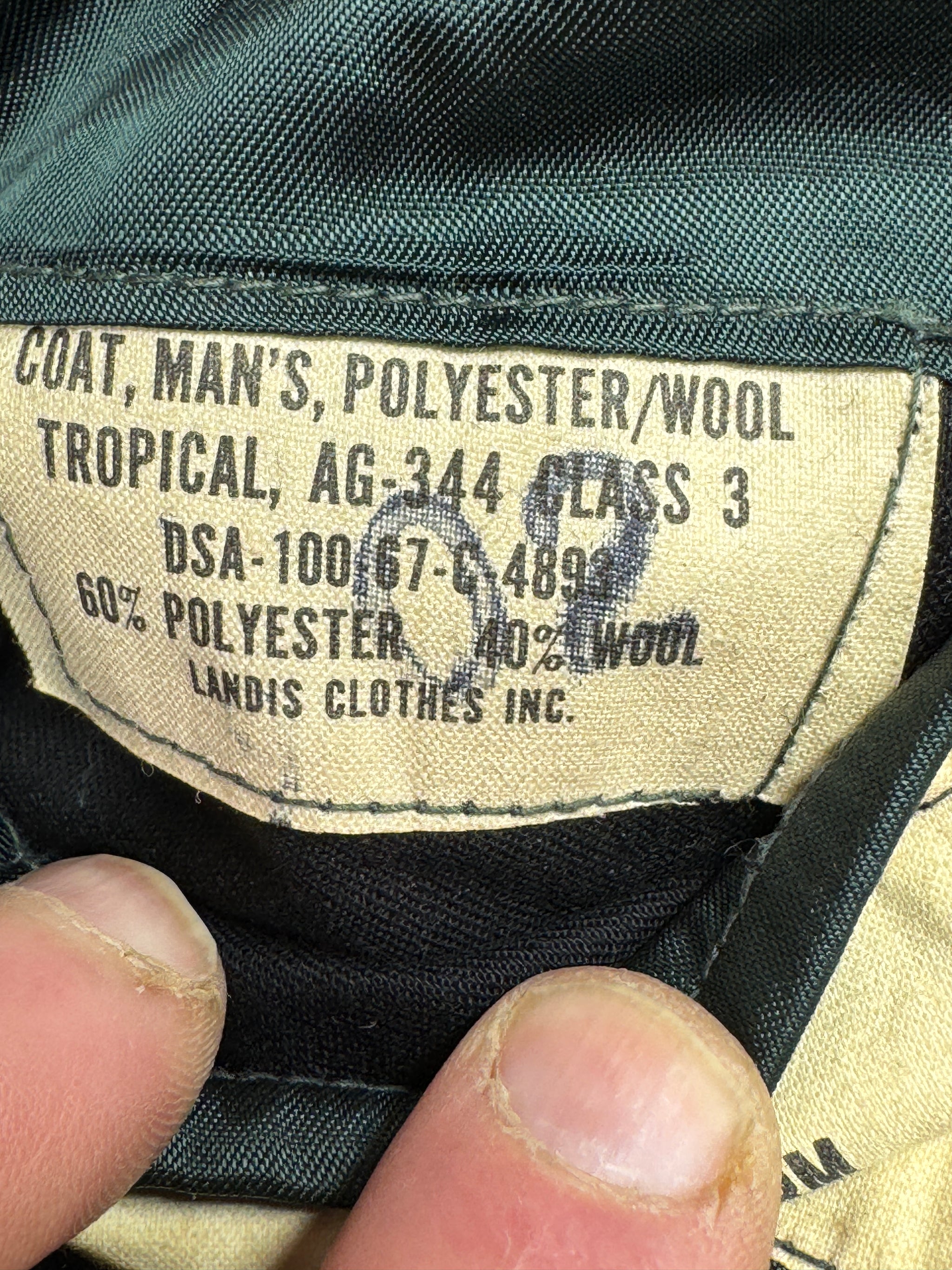 Condition:Excellent Item Description~ Vintage Dated 1959 Military Issue US Army Wool Serge Coat-Named Vintage WW II Rainbow Sword Patch Army Good Conduct Medal Ribbon collar disc...