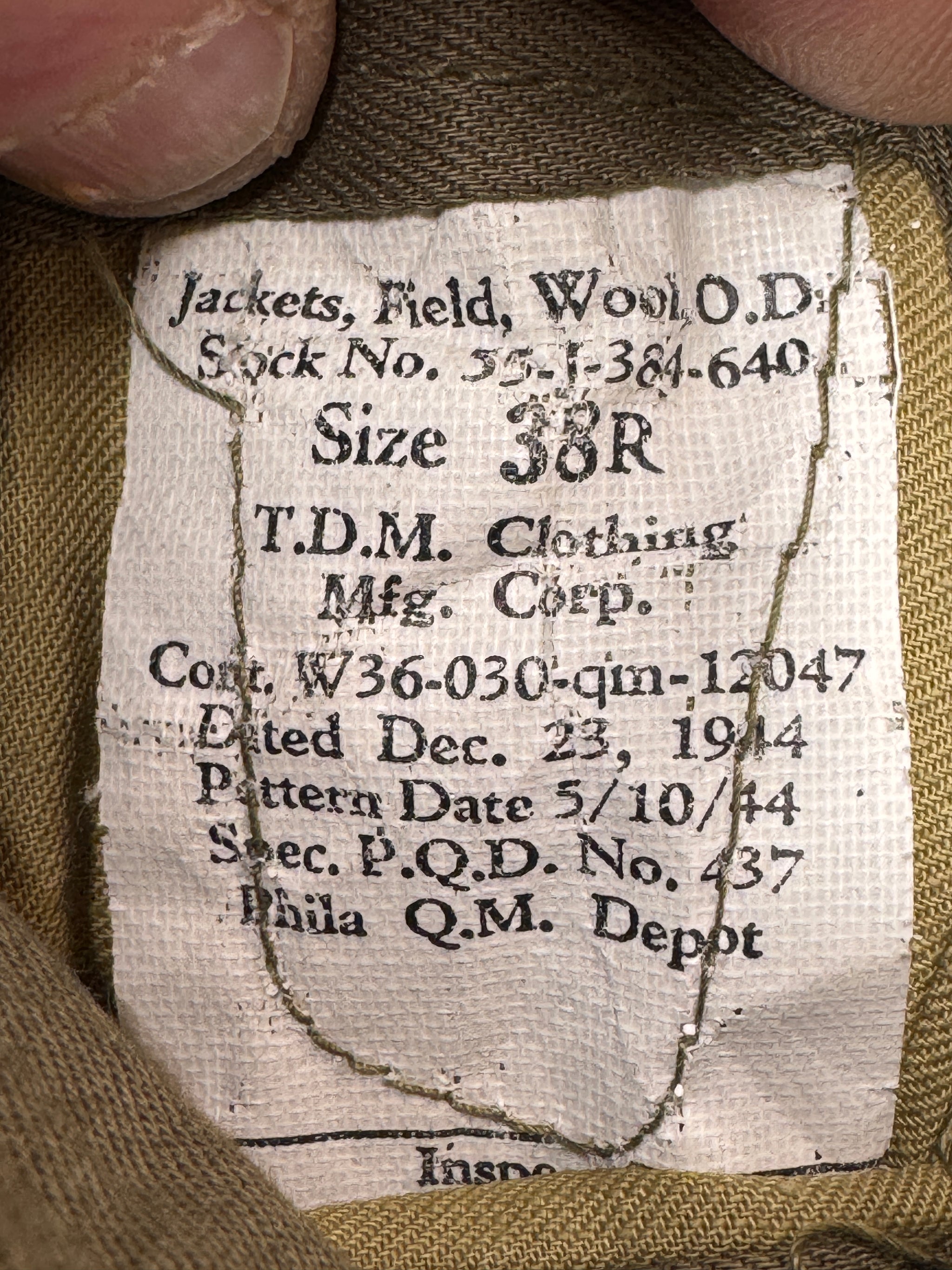 WWII U.S. O.D. Wool Ike Jacket Dated 1944 Size 36 Regular No Insignia