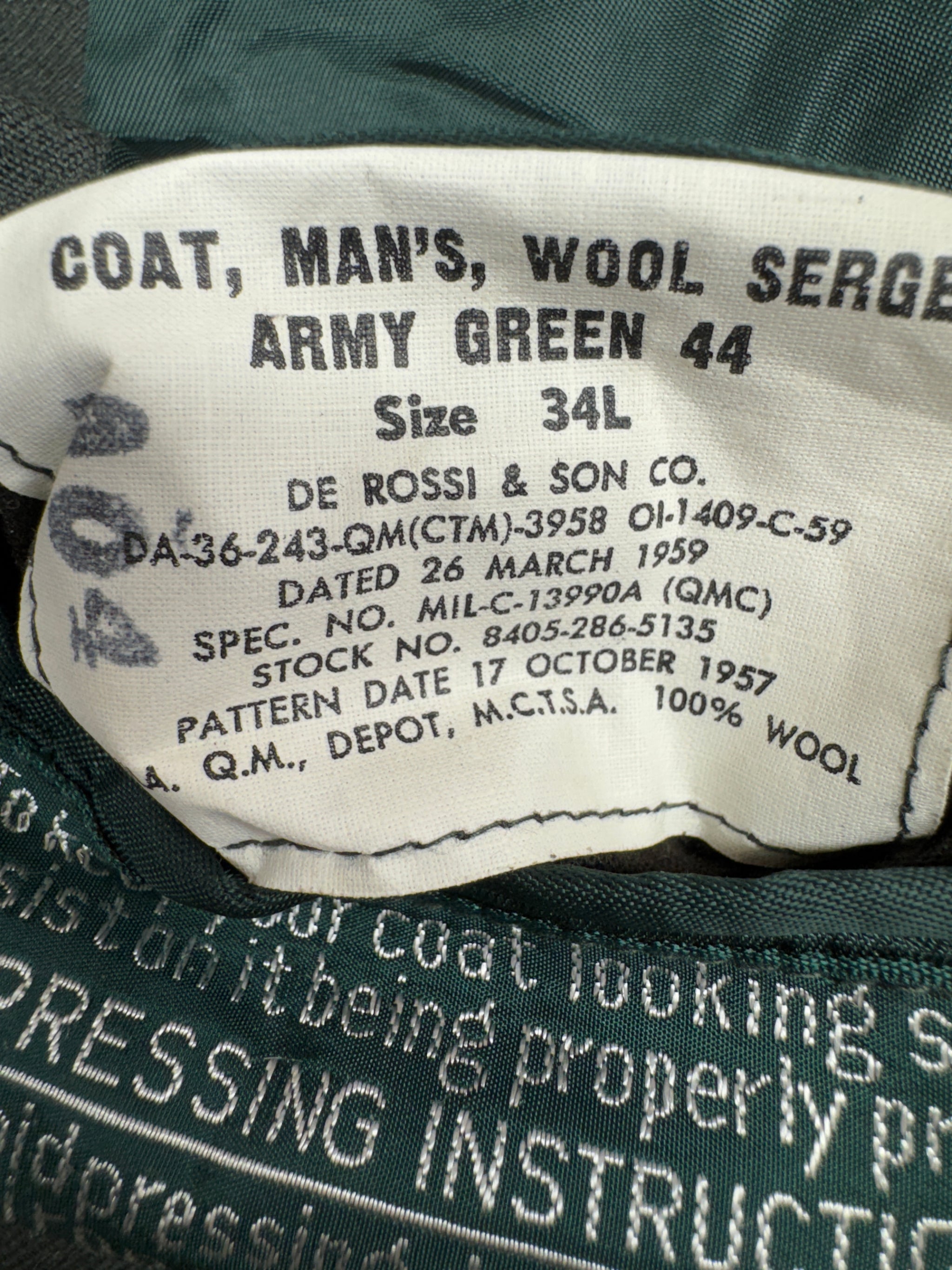 Condition:Excellent Item Description~ Vintage Dated 1959 Military Issue US Army Wool Serge Coat-Named Vintage WW II Rainbow Sword Patch Army Good Conduct Medal Ribbon collar disc...