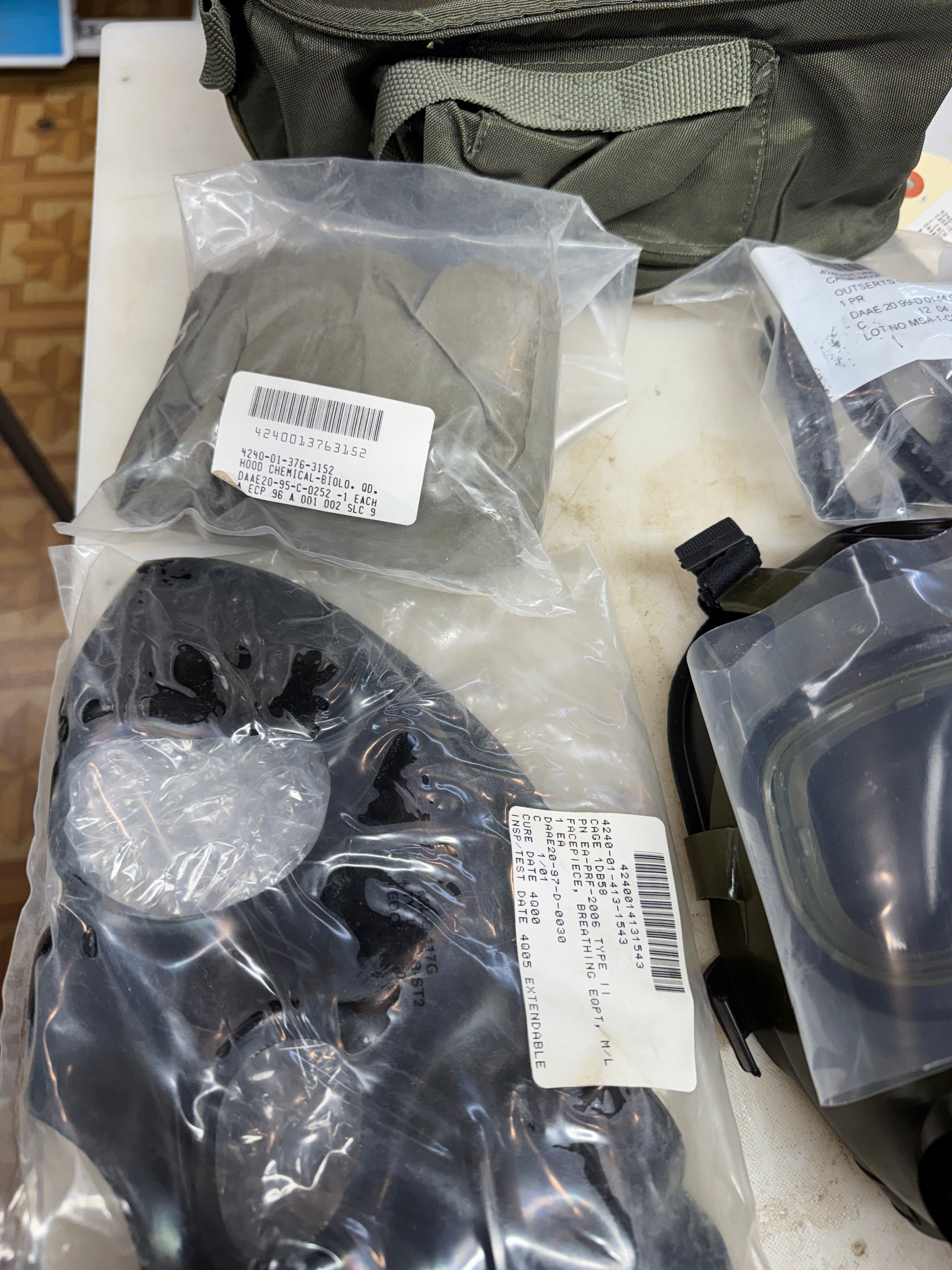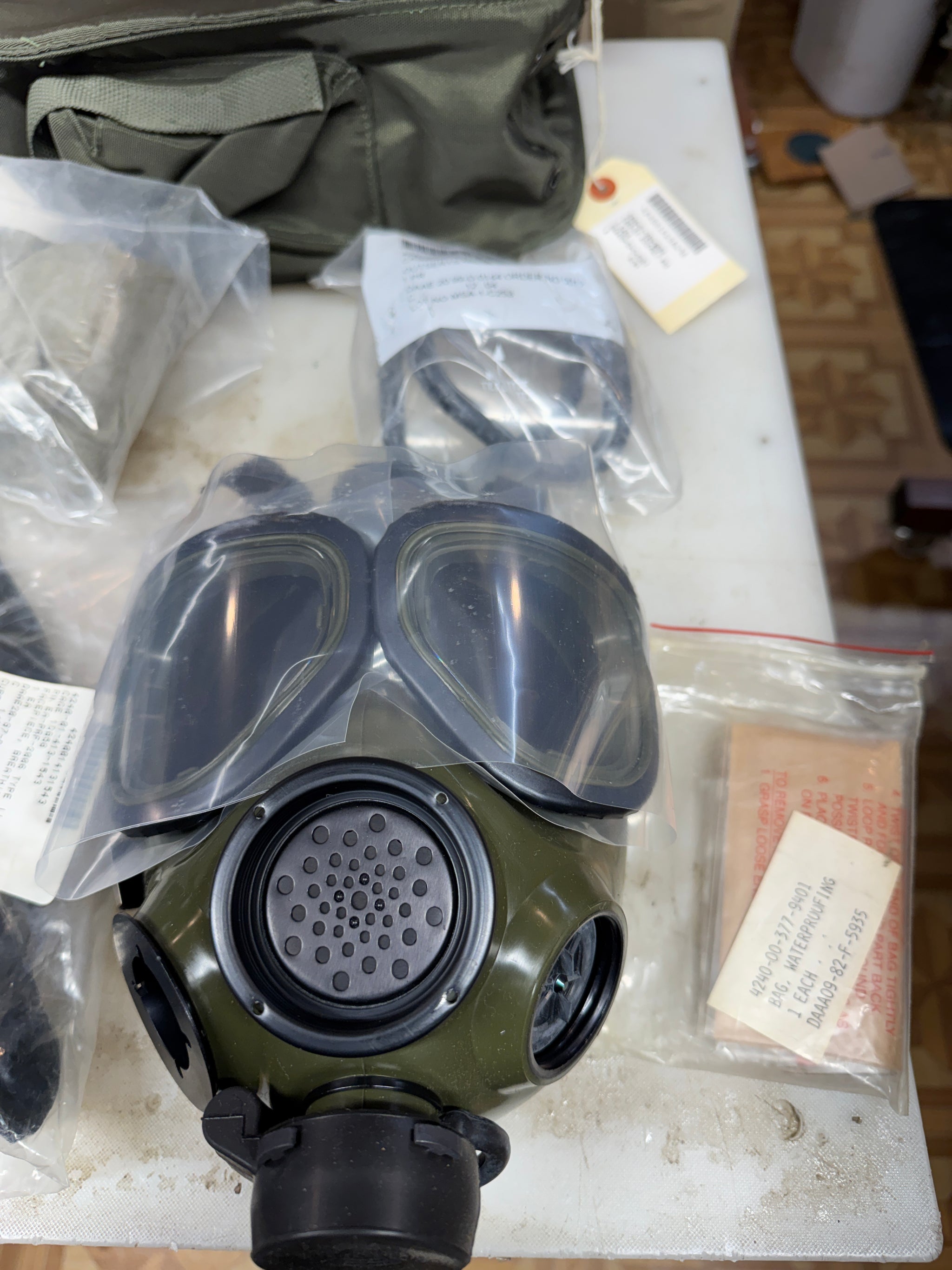 THESE GAS MASK ARE WAREHOUSE INVENTORY- NEW UNISSUED SURPLUS. MAY HAVE MINOR IMPERFECTIONS(FEW SCRATCHES ON LENS,PAINT NICKS). INCLUDES:1-M40 FULL FACE PIECE RESPIRATOR WITH OUTER BLACK...