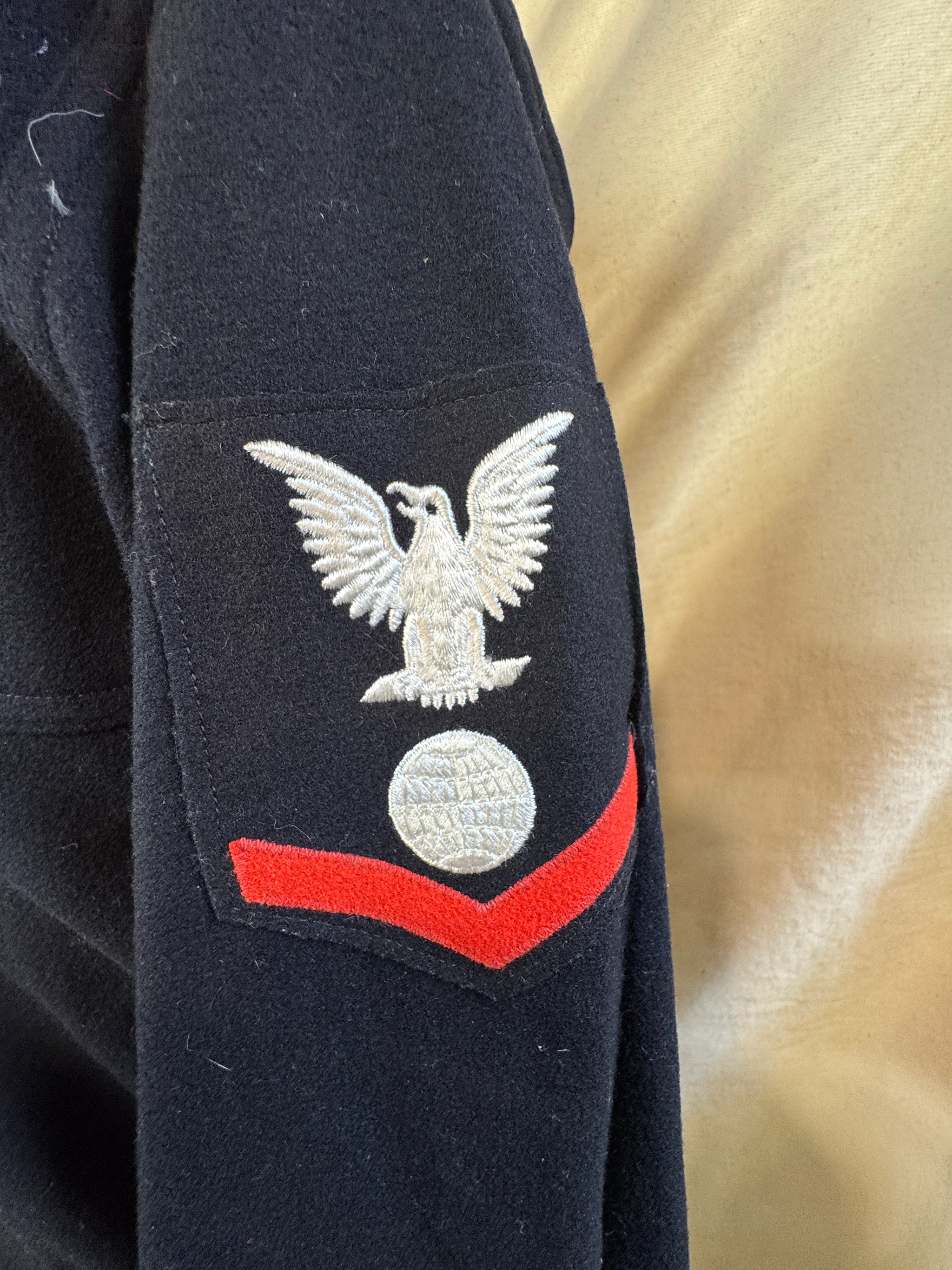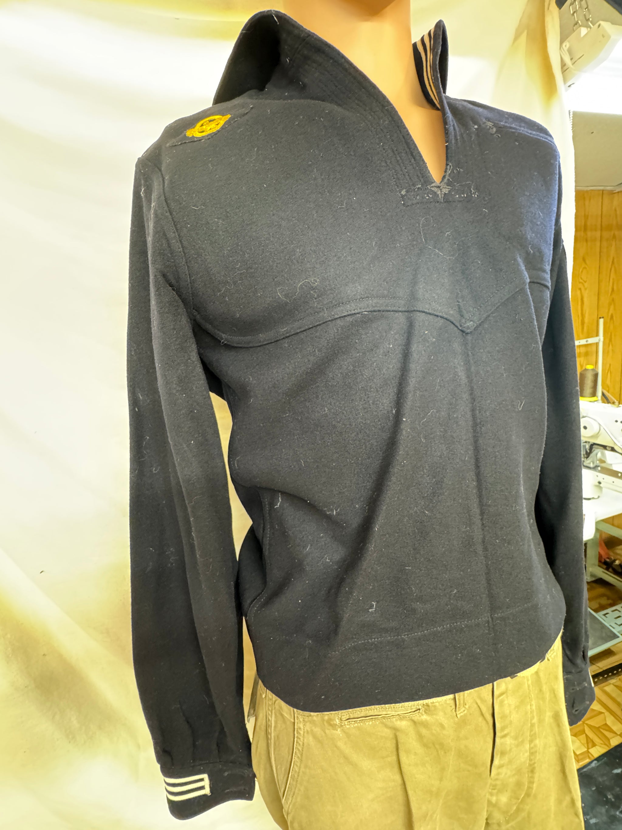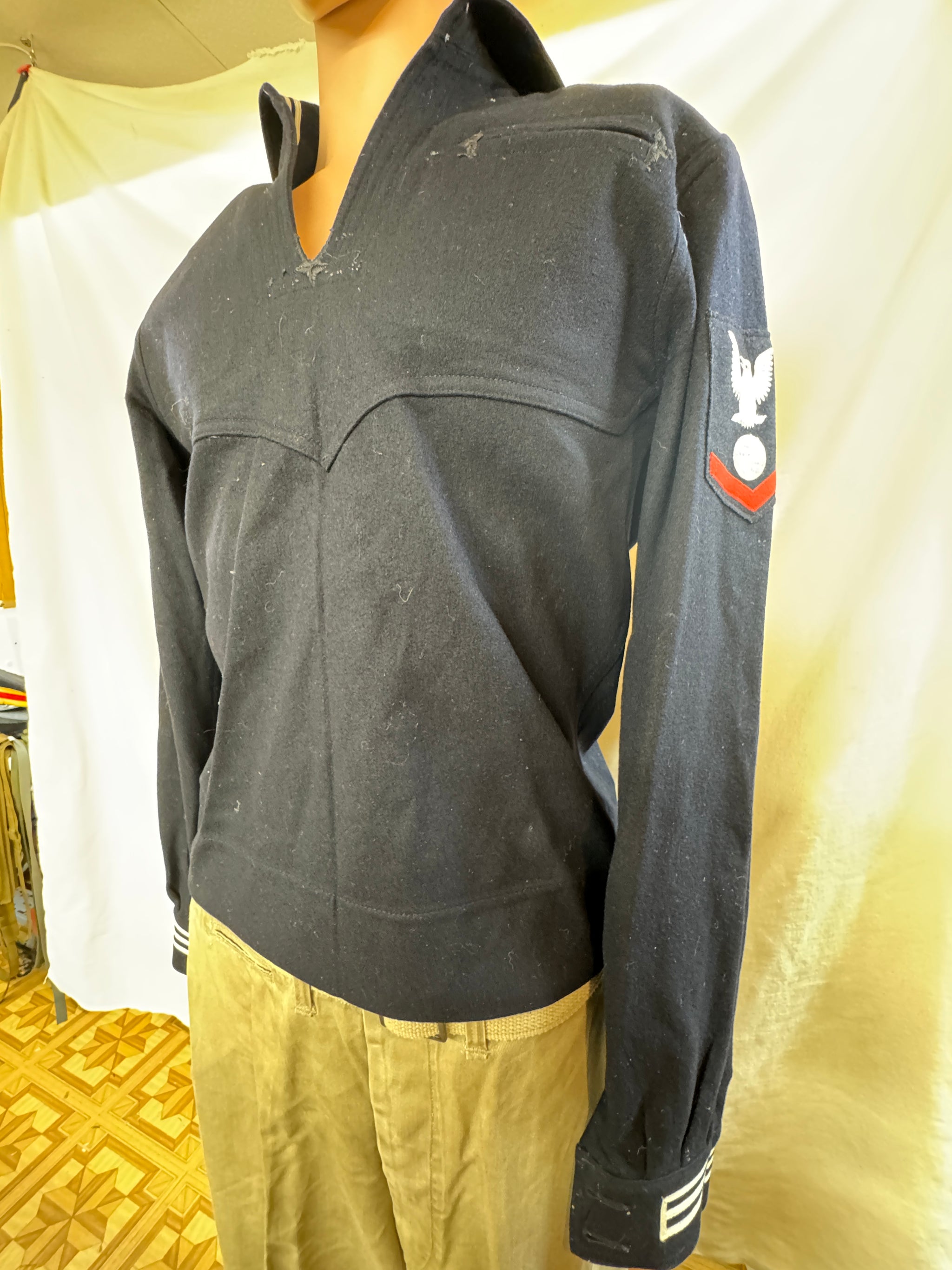 Condition-Vintage Very Good WWII US Navy Boatswain Mate 3rd Rupture Duck Class Dress Blue Jumper Top. No size tag Jumper:measures 16.5 inches shoulder to shoulder,...