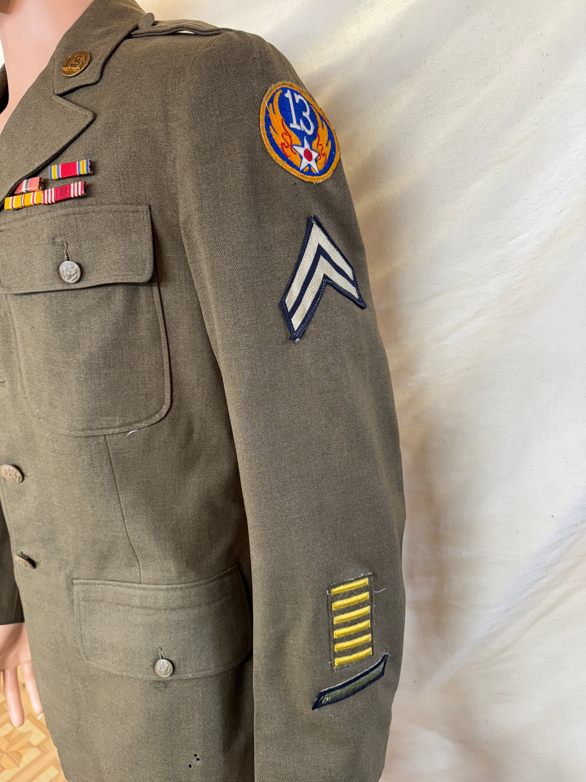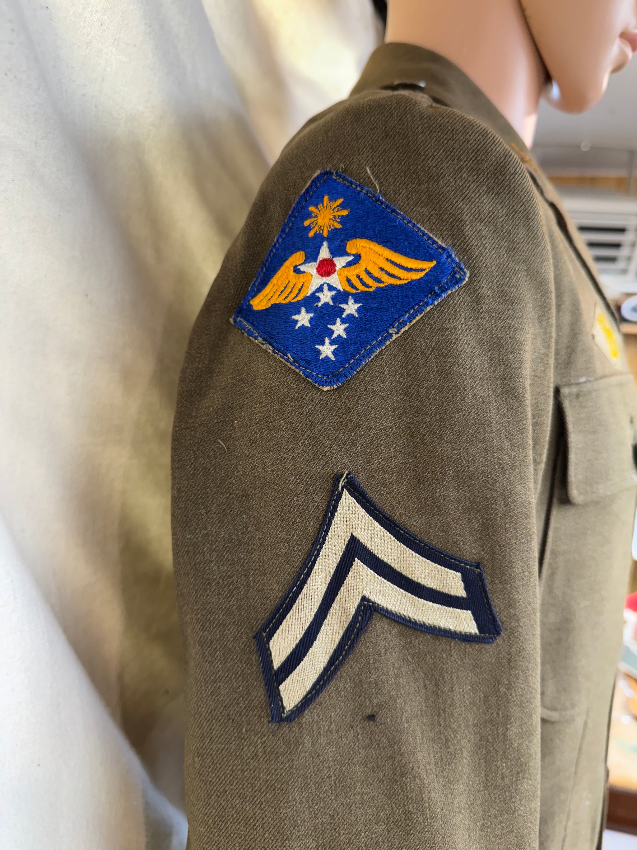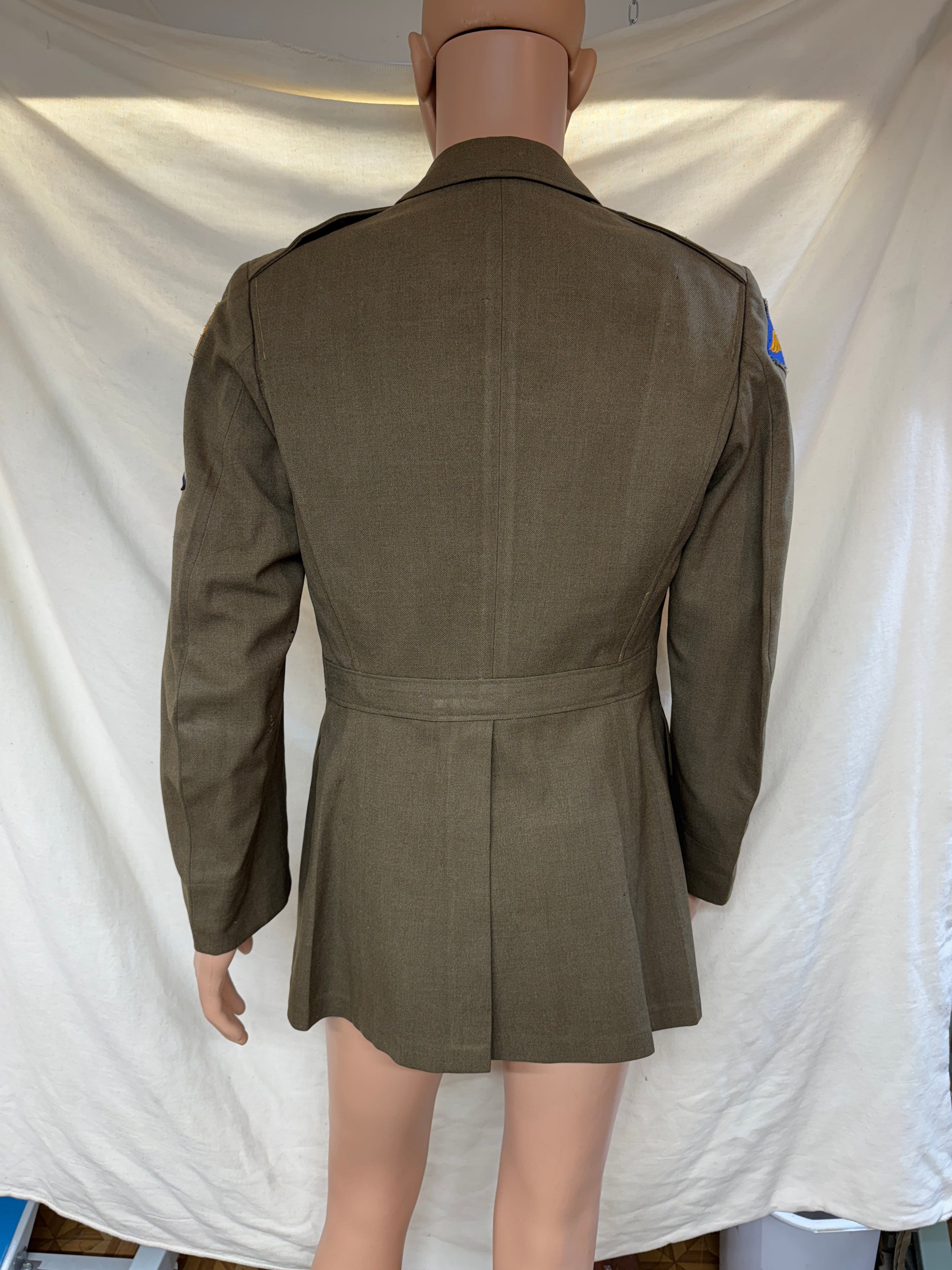 It is size 38Long It has a Service Stripes patch on the left cuff. There is a "US" collar disk, and an Air Corps collar...