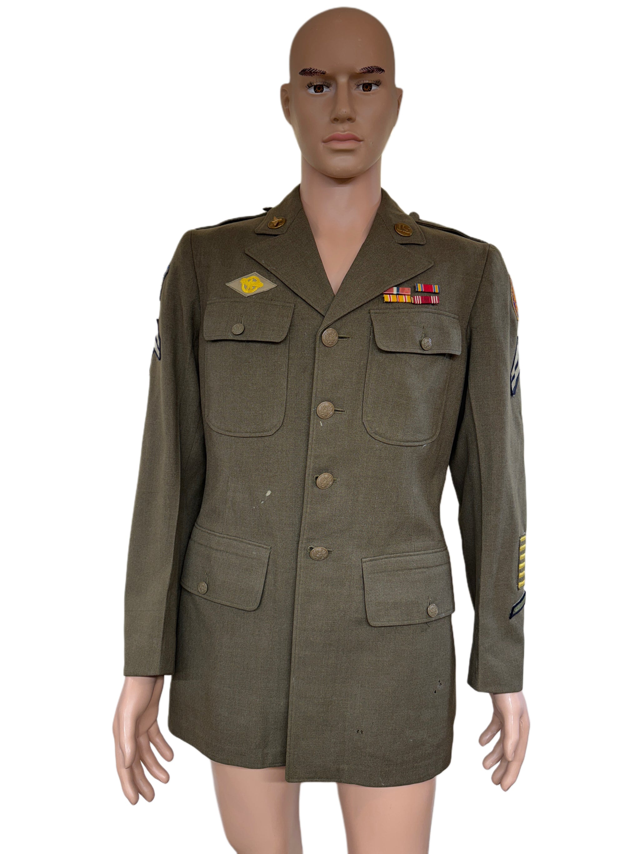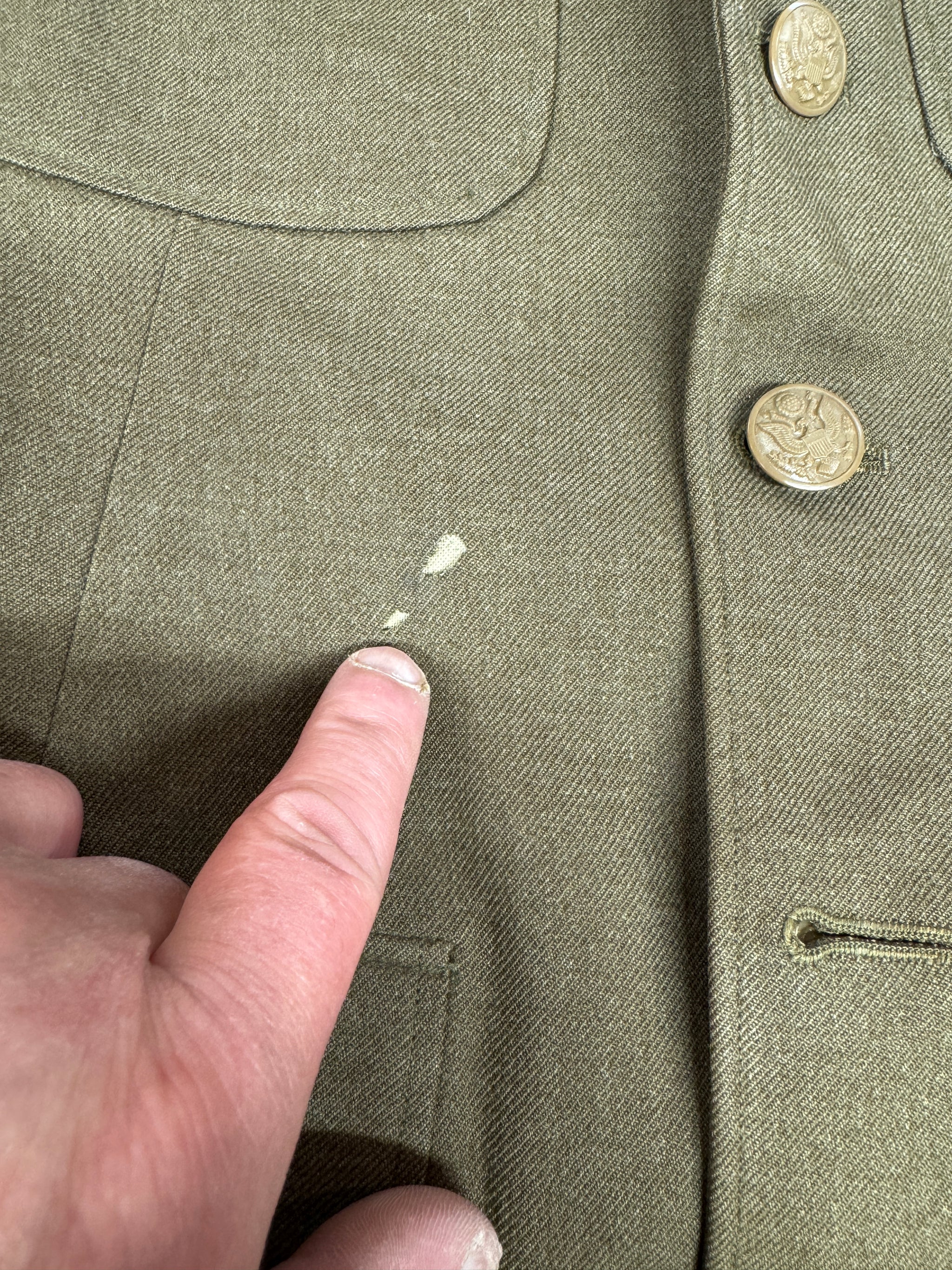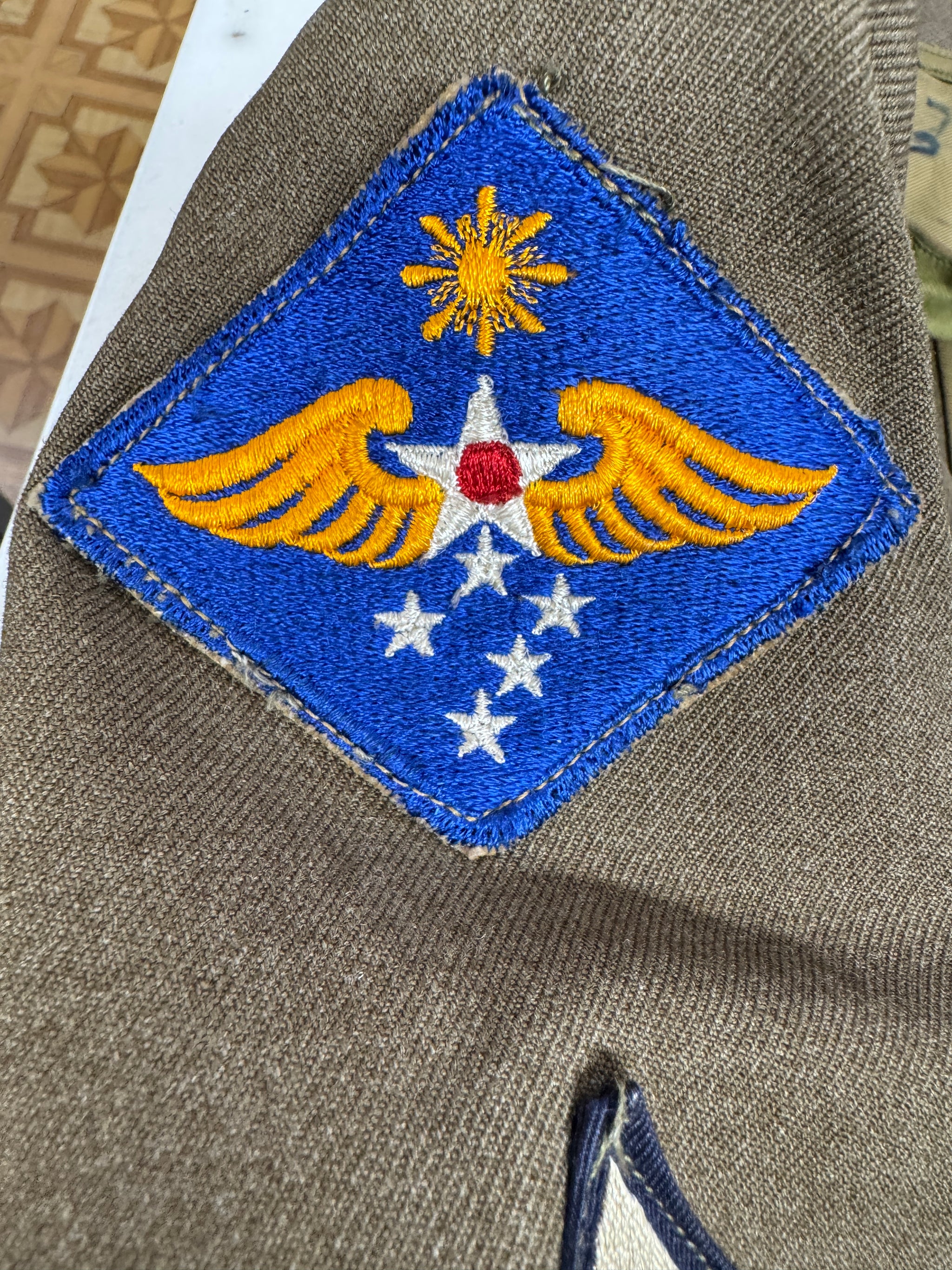 It is size 38Long It has a Service Stripes patch on the left cuff. There is a "US" collar disk, and an Air Corps collar...