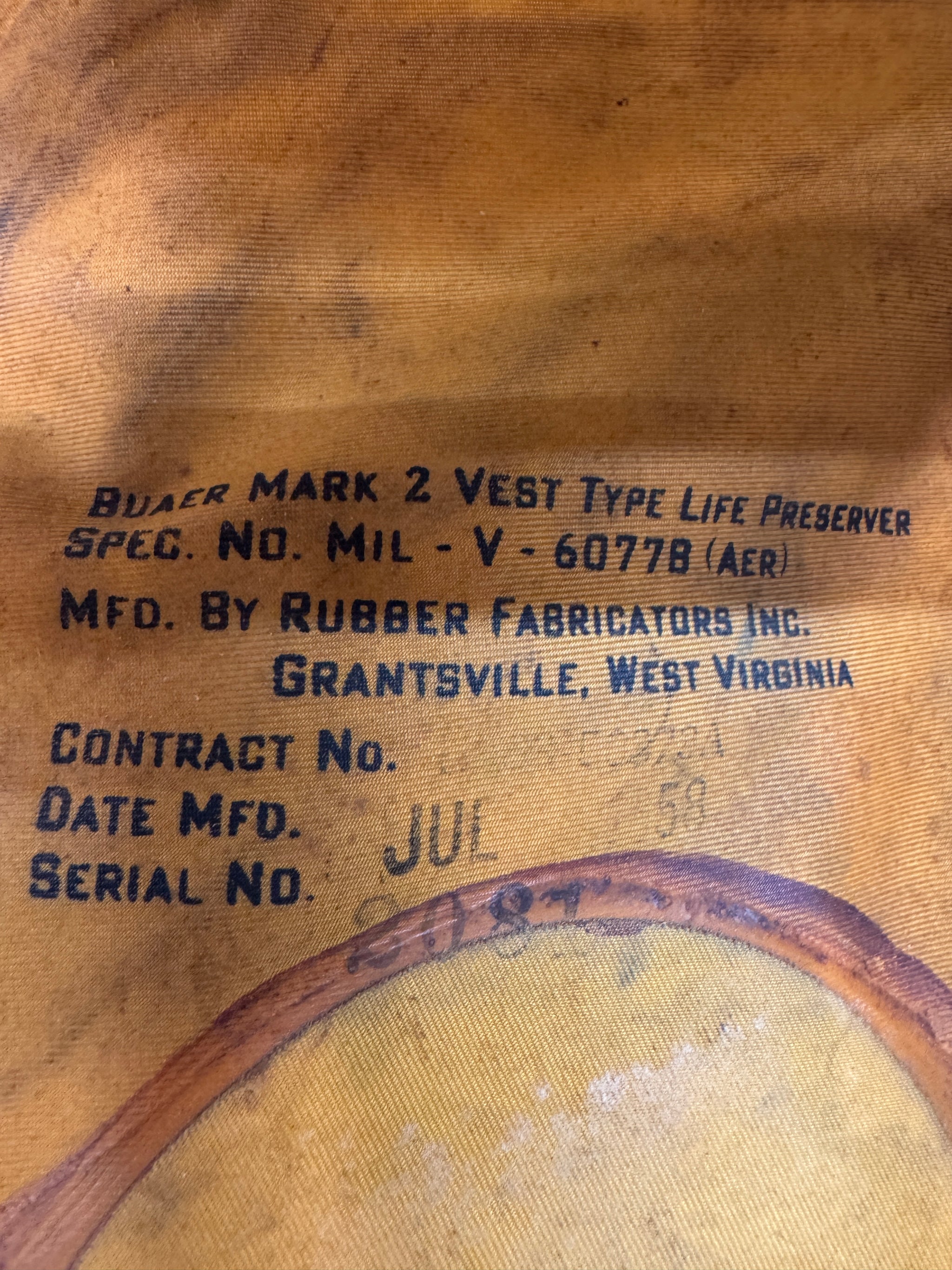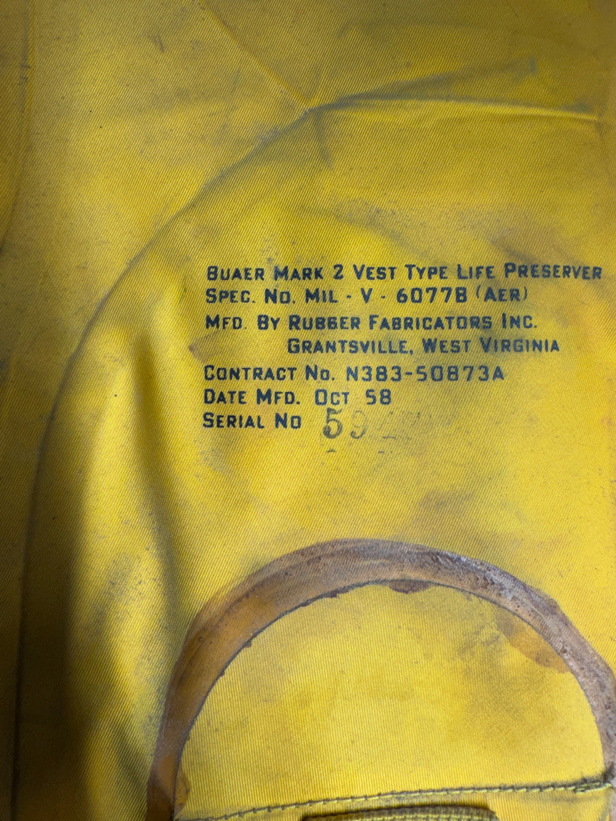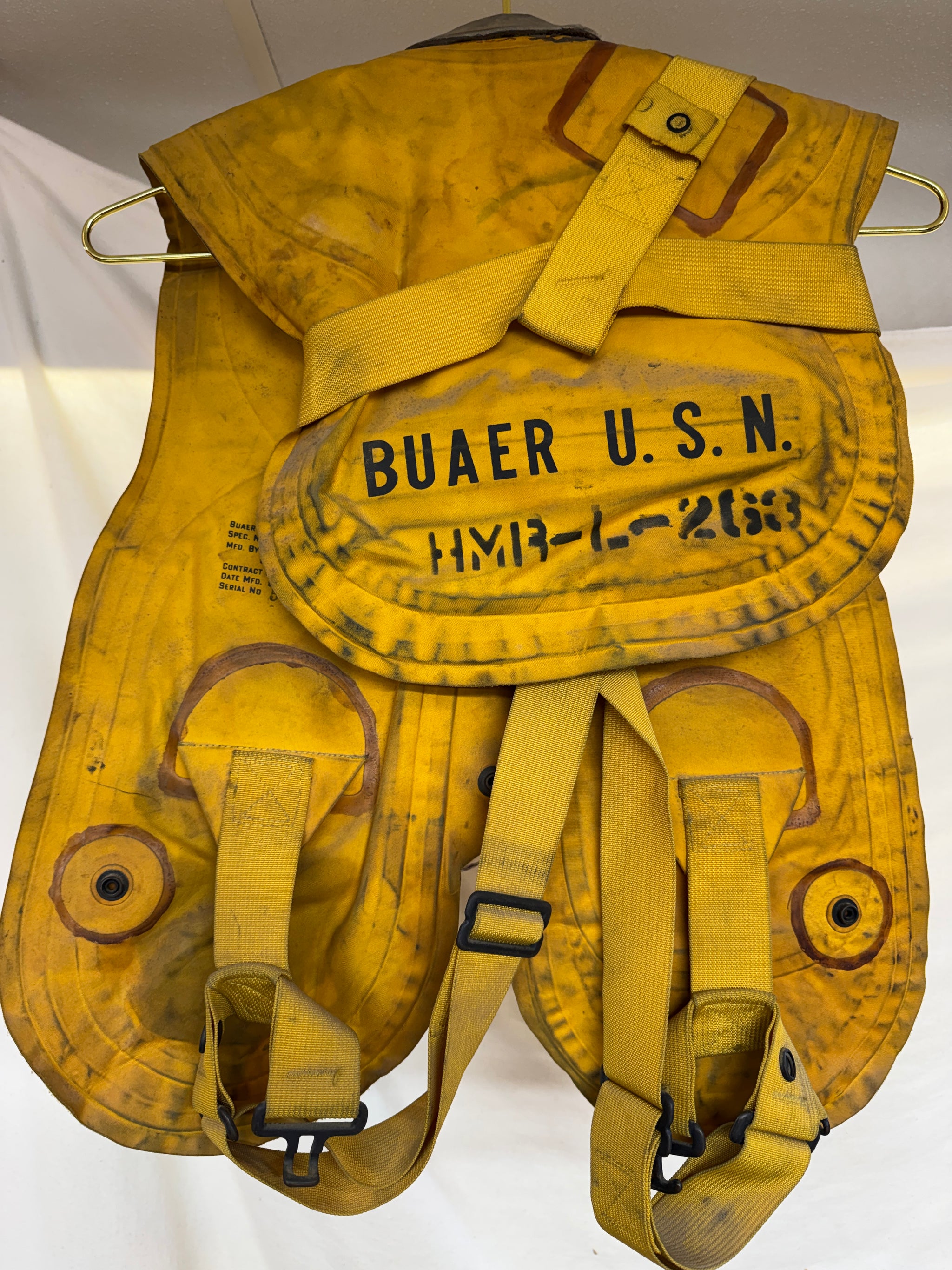 Physical Description United States Navy (USN) Mark 2 pneumatic lift vest; yellow rubberized fabric with rubber air bladders; 2 front pockets for C02 gas canisters;...