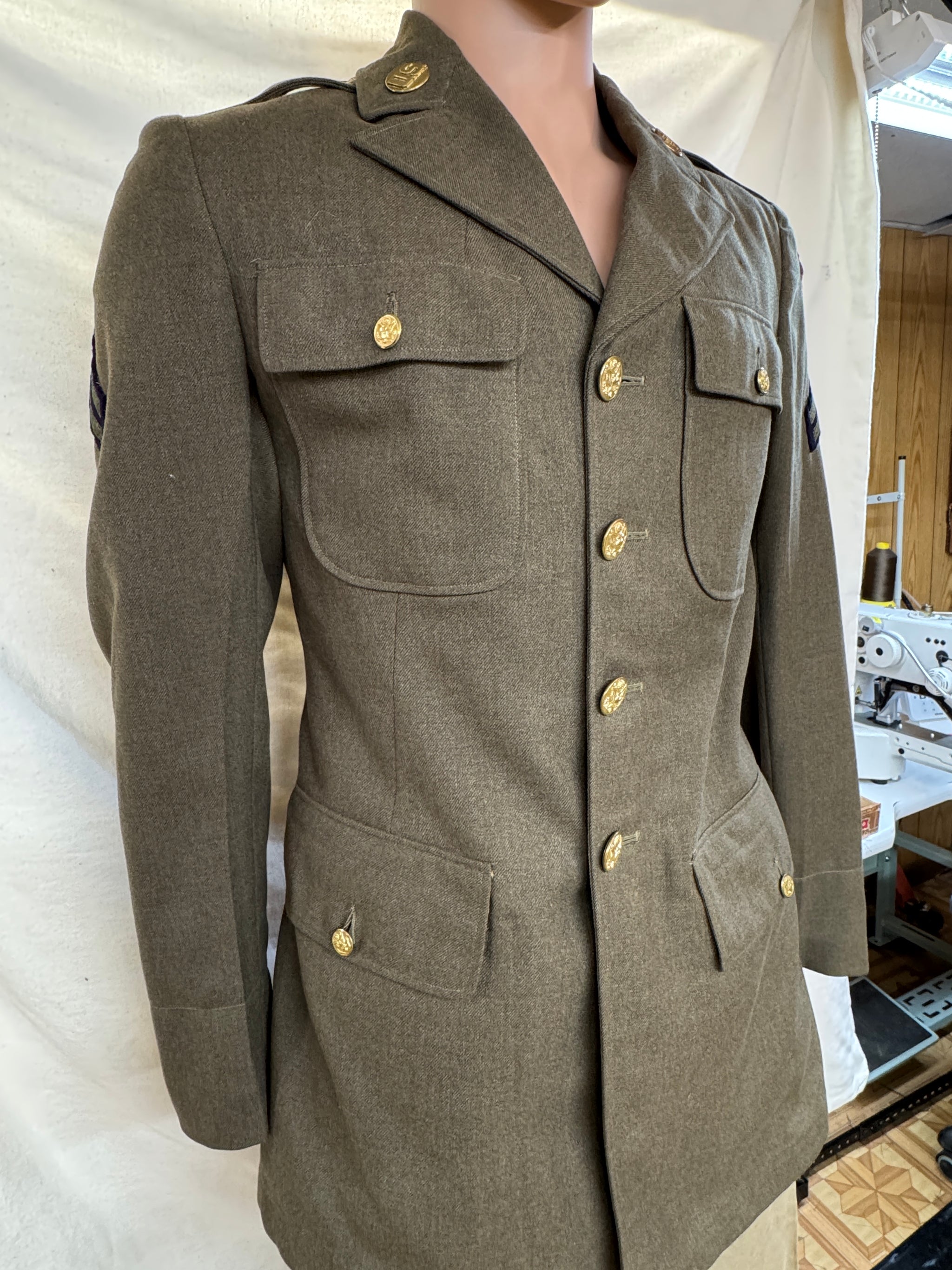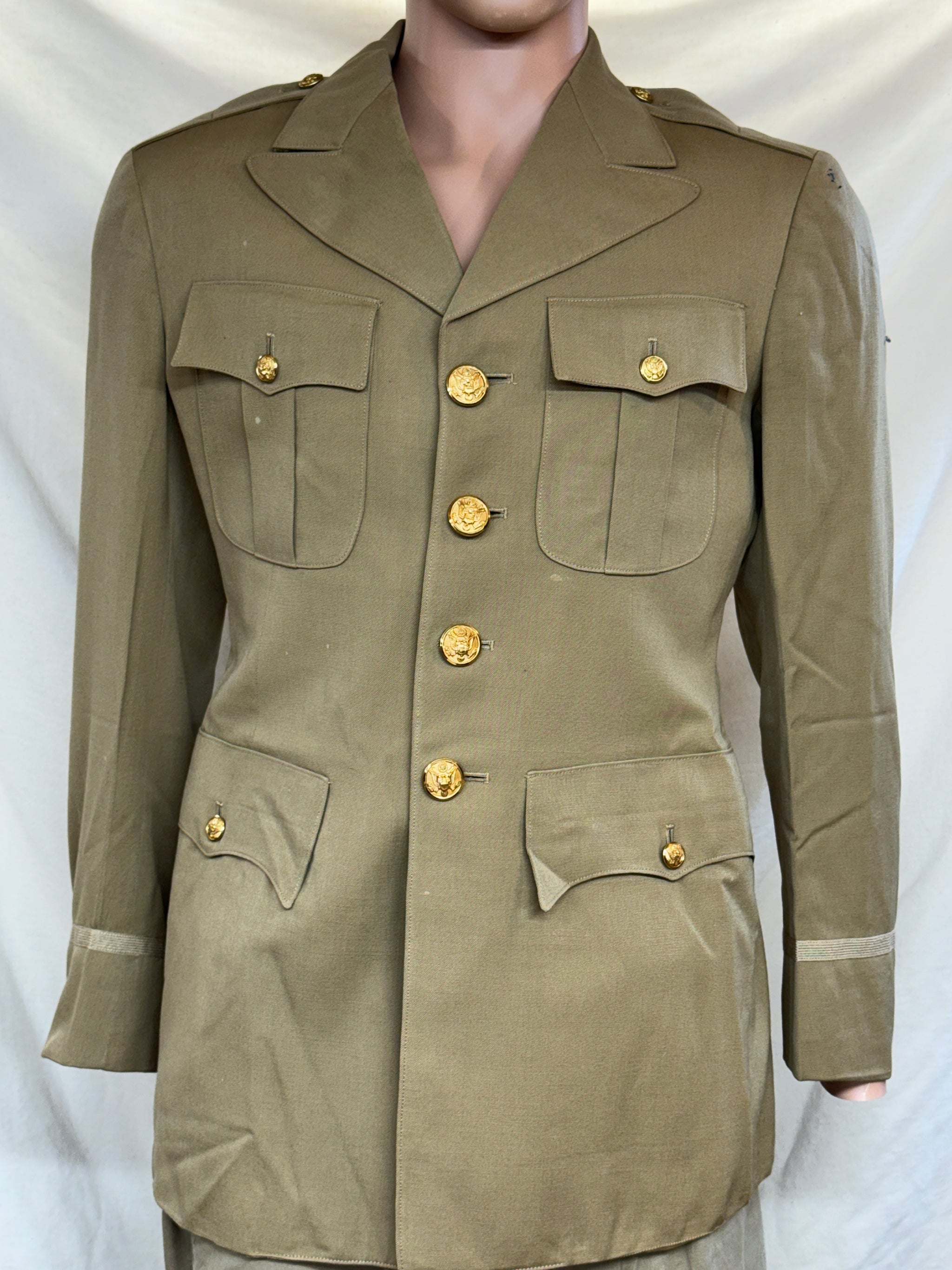Original United States Army enlisted dress Green wool uniform set. This is the lighter-weight AG 344 version , intended for warmer climates. Features classic four-pocket dress jacket with silver buttons and matching trousers.